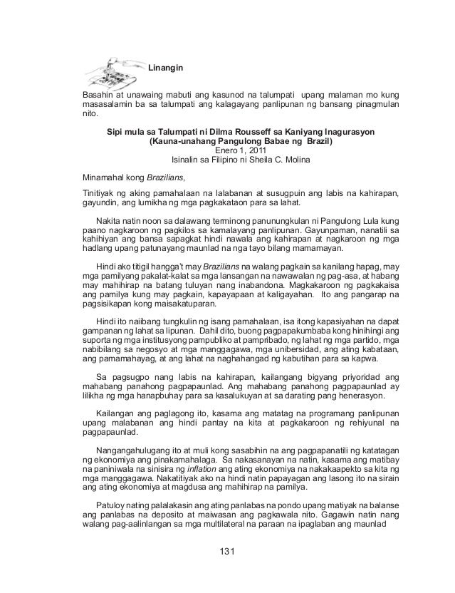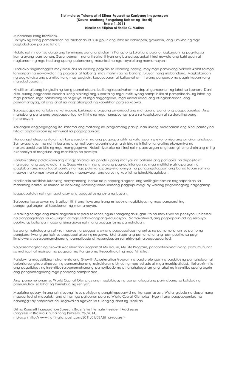 Talumpati mula sa brazil isinalin sa filipino ni sheila c. 5.ipagpapapatuloy niya ang pagsuporta para sa mataas na antas edukasyon sa bansa dahil sa paniniwalang ito ay maging daan upang makamit ng kanyang mga mamamayan ang kaginhawaan. Naging chief of staff din siya noong 2005. Republika ng pilipinas ang aklat na ito ay magkatuwang na inihanda at sinuri ng mga edukador mula sa mga publiko at pribadong paaralan at pamantasan. Talumpati ni dilma rousseff sa kanyang inagurasyon aralin 2.1: